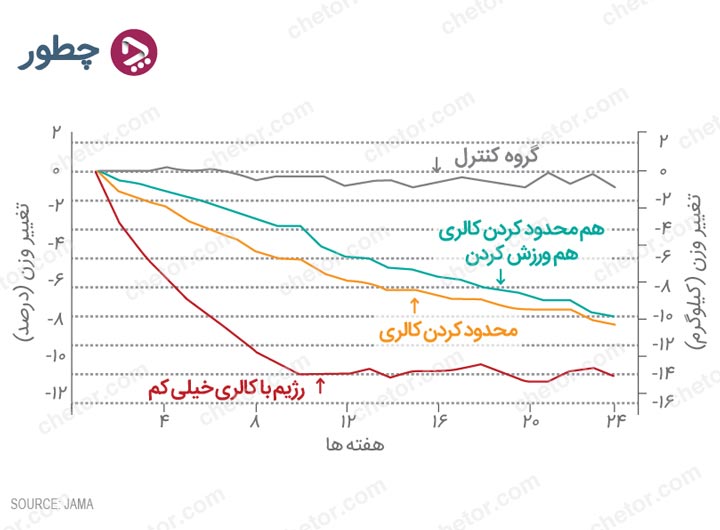 عموما رژیم غذایی همراه با ورزش بهتر از کم کردن کالری به تنهایی نتیجه میدهد. ولی ورزش فقط تأثیر جزئی بر کاهش وزن دارد. جدول زیر نتایج یک آزمایش بر روی عدهای فرد چاق که تصادفی انتخاب شدهاند را نشان میدهد. طبق این نمودار، گروهی که کالریهایشان را محدود کردند تقریبا به اندازهی گروهی که هم رژیم گرفتند و هم ورزش میکردند کاهش وزن داشتند، در حالی که گروه ورزشکار کمتر از گروه دیگر محدودیت کالری داشتند.