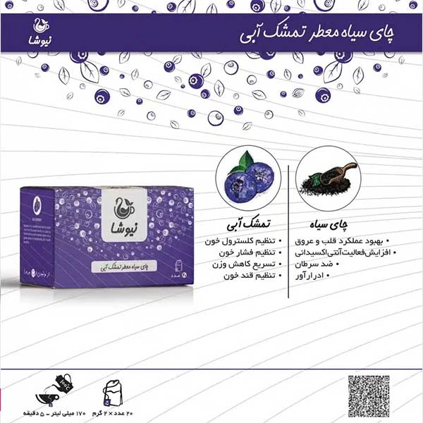 دمنوش تمشک آبی نیوشا یک نوشیدنی گیاهی است که از چای سیاه و عصاره تمشک آبی تهیه شده است. تمشک آبی یا بلوبری، میوهای کوچک و آبی رنگ با خواص آنتیاکسیدانی بالا است. این میوه به دلیل داشتن ویتامینها، مواد معدنی و فیبر فراوان، برای سلامتی بسیار مفید است.