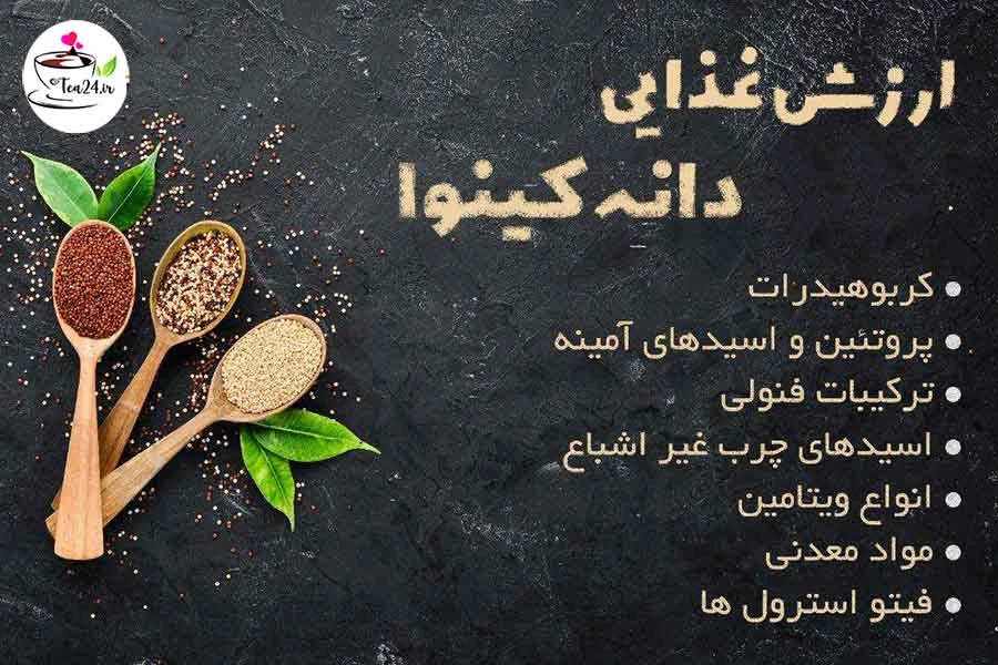دانه کینوا از پروتئین، مواد معدنی و ویتامین های زیادی تشکیل شده است. و بسیار مغذی میباشد.پروتئین و اسید امینه :